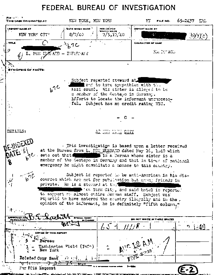 In 1940, L. Ron Hubbard was living a hand-to-mouth existence in New York City, writing penny-a-word pulp fiction stories. Whilst there, he apparently had an argument with a steward in the hotel at which he was staying. He promptly got revenge by denouncing to the FBI the unfortunate man, who was of German descent, as being "a menace to the state". This was, it seems, the first contact he had had with the FBI and began what became a long tradition for him of denouncing to the authorities those he disliked. It also emphasised his Germanophobia, a trait which he never lost (and which is still visible today in the Church of Scientology's campaign against the Federal Republic). Needless to say, the allegation was patently baseless and the FBI took no action.